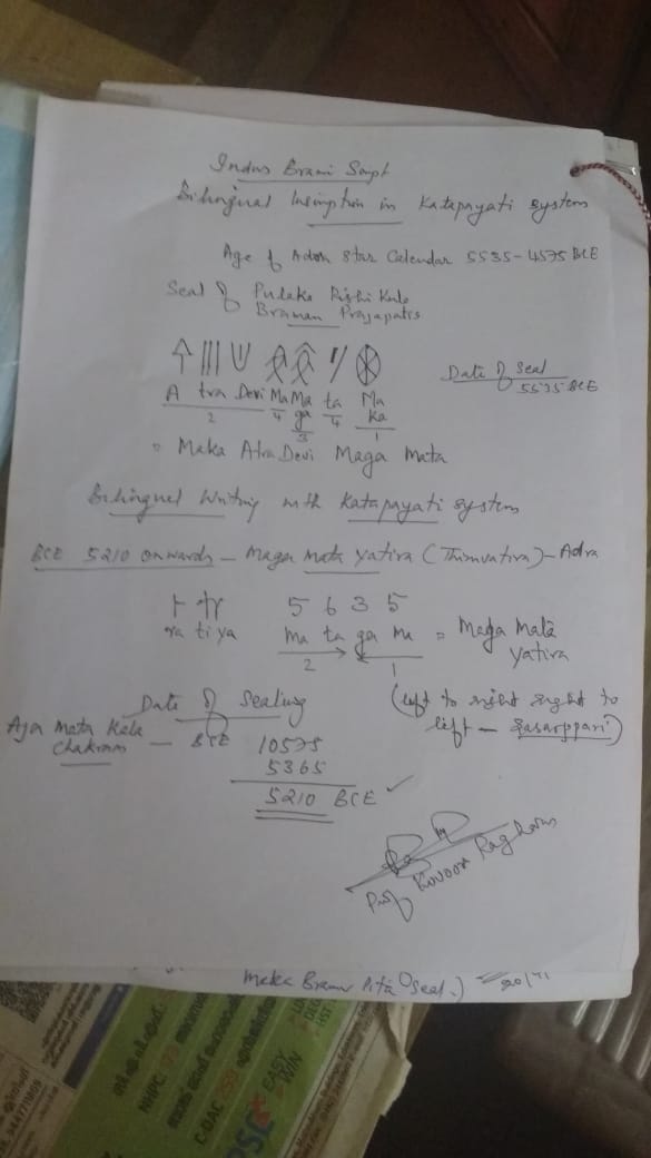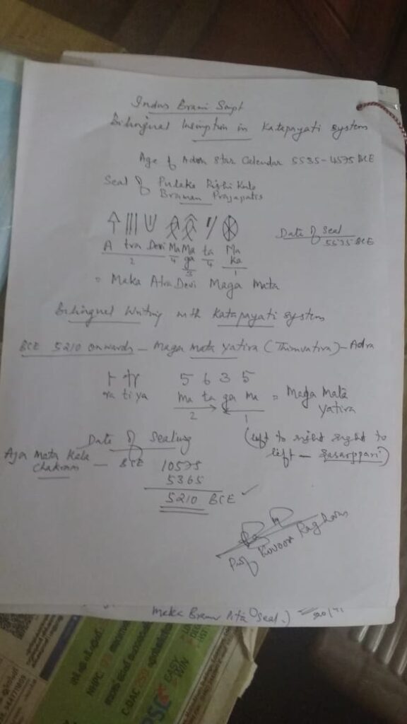 - Discovery of katapayadu system of recording years in Indus seals (Ajamaka kala chakra).